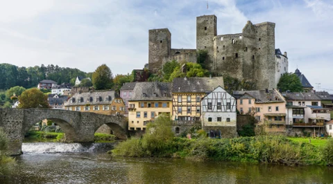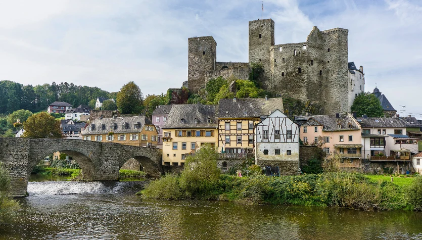Malowniczy zamek nad brzegiem rzeki. Ta budowla ma ponad 1000 lat