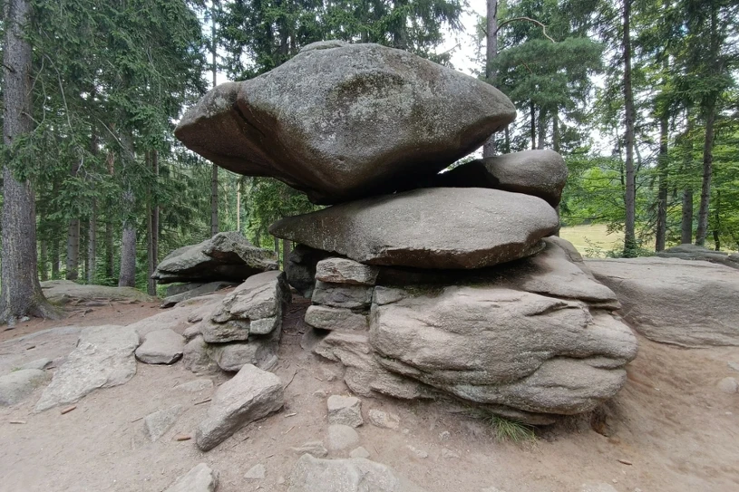 Głaz Chybotek to jedna z najbardziej intrygujących form skalnych w Sudetach i prawdziwa geologiczna osobliwość. Znajduje się na pograniczu Szklarskiej Poręby Średniej i Dolnej, na wysokości około 565 m n.p.m. Ta charakterystyczna grupa granitowych bloków powstała w wyniku długotrwałych procesów erozyjnych, które doprowadziły do oddzielenia się skał i ich niezwykłego ułożenia. Największy z głazów — siedmiokątny, o średnicy około czterech metrów i wadze kilkudziesięciu ton — wsparty jest jedynie w dwóch punktach. Dzięki temu możliwe jest wprawienie go w delikatny ruch wahadłowy, co od wieków budziło zachwyt i zdumienie turystów oraz badaczy. Tego typu formacje, nazywane chybotkami, należą do wyjątkowych zjawisk geomorfologicznych i występują jedynie w kilku miejscach na świecie.