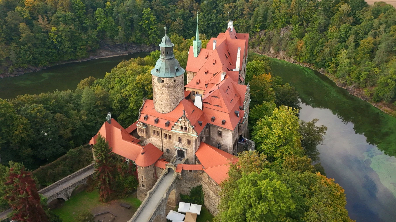 Zamek Czocha leży w osadzie Sucha w gminie Leśna, w województwie dolnośląskim, około 35 kilometrów od Jeleniej Góry i blisko granicy z Czechami. Warownię wzniesiono na skalnym cyplu nad Jeziorem Leśniańskim, co od początku nadawało jej charakter strażnicy granicznej. Najstarsza część pochodzi z przełomu XIII i XIV wieku i obejmuje stołp obudowany częścią mieszkalną oraz mury tworzące dziedziniec z wjazdem od zachodu. W kolejnych stuleciach dobudowywano renesansowe skrzydła, nowożytne basteje i elementy obronne, które zwiększały zarówno funkcję militarną, jak i reprezentacyjną. Dzięki temu Czocha pokazuje wyraźnie kolejne warstwy rozwoju - od średniowiecza po epokę nowożytną.