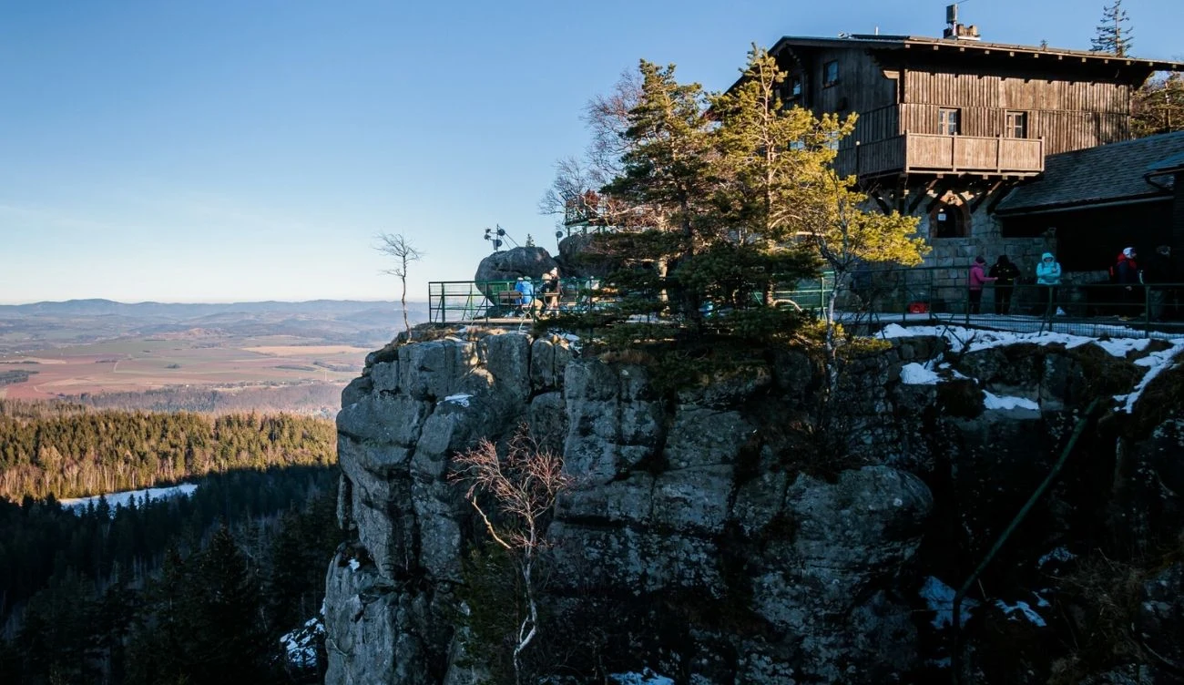 Tuż obok znajdują się punkty widokowe, z których rozciągają się malownicze panoramy obejmujące m.in. Karkonosze ze Śnieżką, Góry Sowie, a nawet Kamienne i Broumovskie Steny.