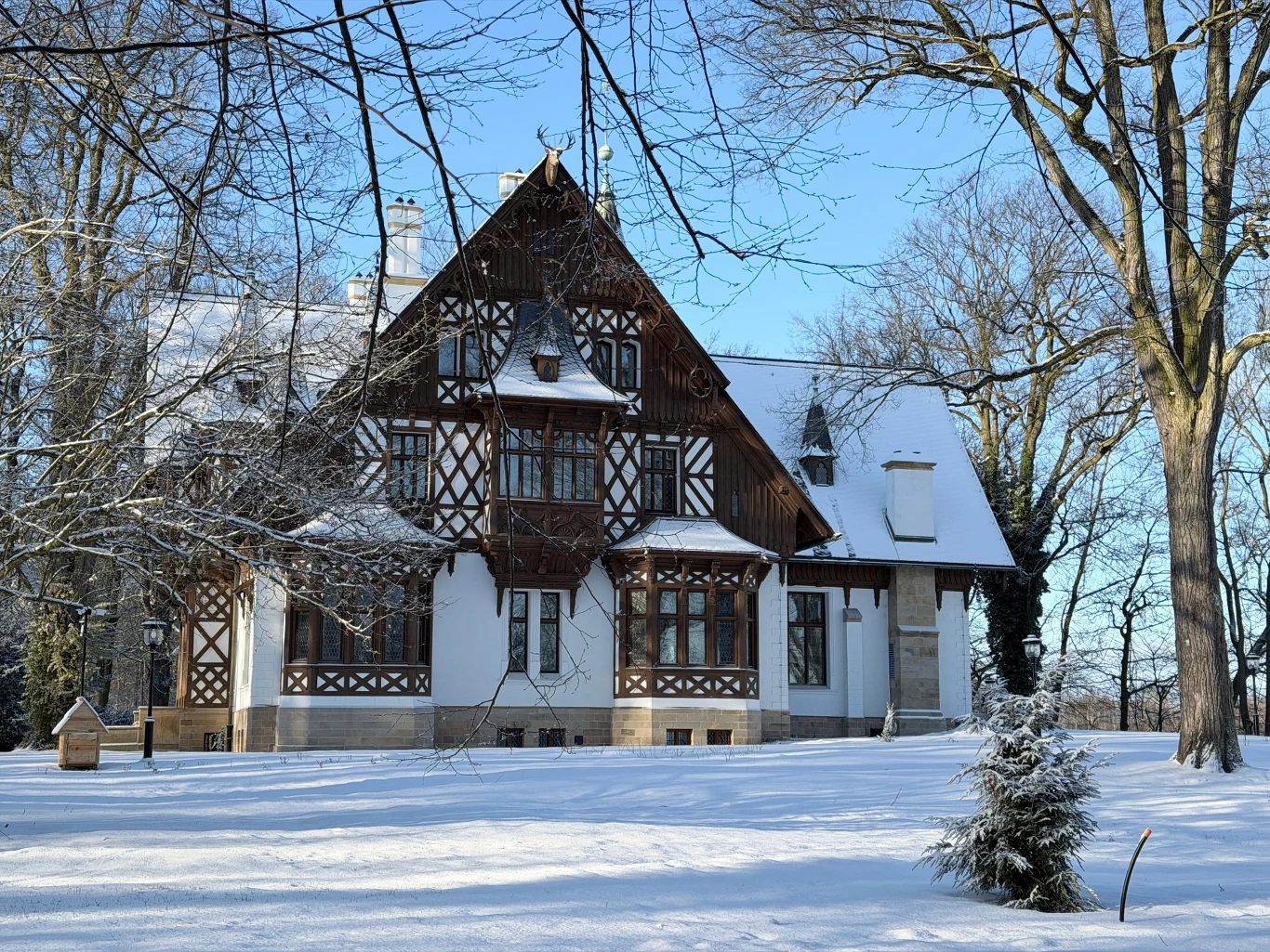 Choć odbudowany pałac nawiązywał do swojej poprzedniej formy, wprowadzono wiele zmian jak choćby kręcone schody w holu czy strzeliste okienka. Sama forma budynku zmieniła się z drewnianej na murowaną. Przed pałacem stanęła rzeźba św. Huberta z jeleniem - patrona myśliwych autorstwa Balthasara Jandy. Ponoć twarz świętego ma rysy księcia Hansa Heinricha XI von Hochberga.