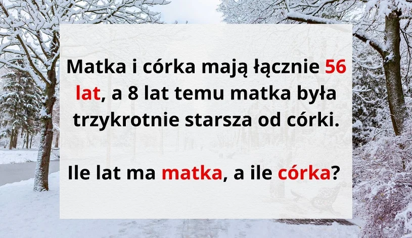 Żeby poznać wiek matki i córki, muszą zostać spełnione dwa warunki. Matka musi być 3 razy starsza od córki, a suma wieku musi wynosić 40. Niektórym od razu rozwiązanie rzuca się w oczy. Czasem jednak trzeba sięgnąć po matematykę lub zdać się na intuicję. Wystarczy potraktować sytuację sprzed 8 lat jako punkt wyjścia.