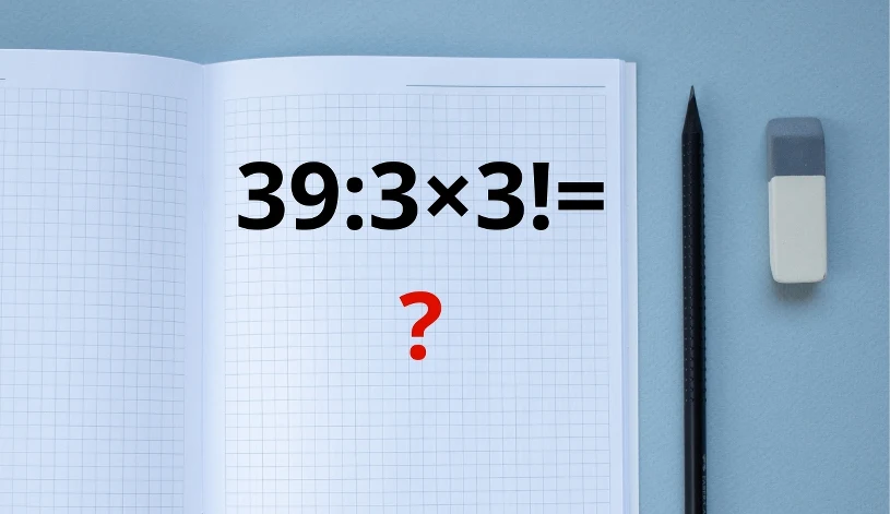 Dzisiejsze zadanie to krótkie działanie: 39:3×3!=?. Jego forma jest prosta, ale wymaga od nas uwagi, szczególnie w kwestii kolejności wykonywania działań. Porządnie się skup i spróbuj rozwiązać to zadanie bez dodatkowych pomocy — kalkulator nie będzie ci potrzebny. Uruchom swoją wyobraźnię, a działania wykonaj w pamięci.