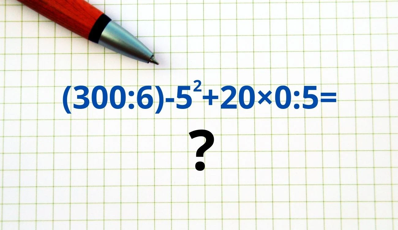 Zaczynamy od pozbycia się nawiasu, a więc 300:6=50. To działanie można łatwo obliczyć w pamięci, ponieważ wystarczy policzyć 30:6=5 i dopisać jedno zero do wyniku. Następnie potęgowanie: 52=25. Teraz podstaw otrzymane wyniki do wyrażenia arytmetycznego z treści zagadki: