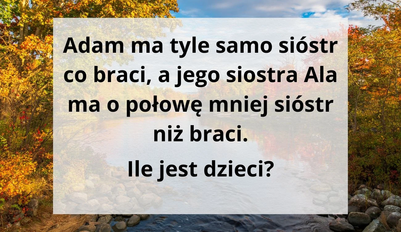 Treść tej ciekawej zagadki logicznej brzmi: Adam ma tyle samo sióstr co braci, a jego siostra Ala ma o połowę mniej sióstr niż braci. Ile jest dzieci?
