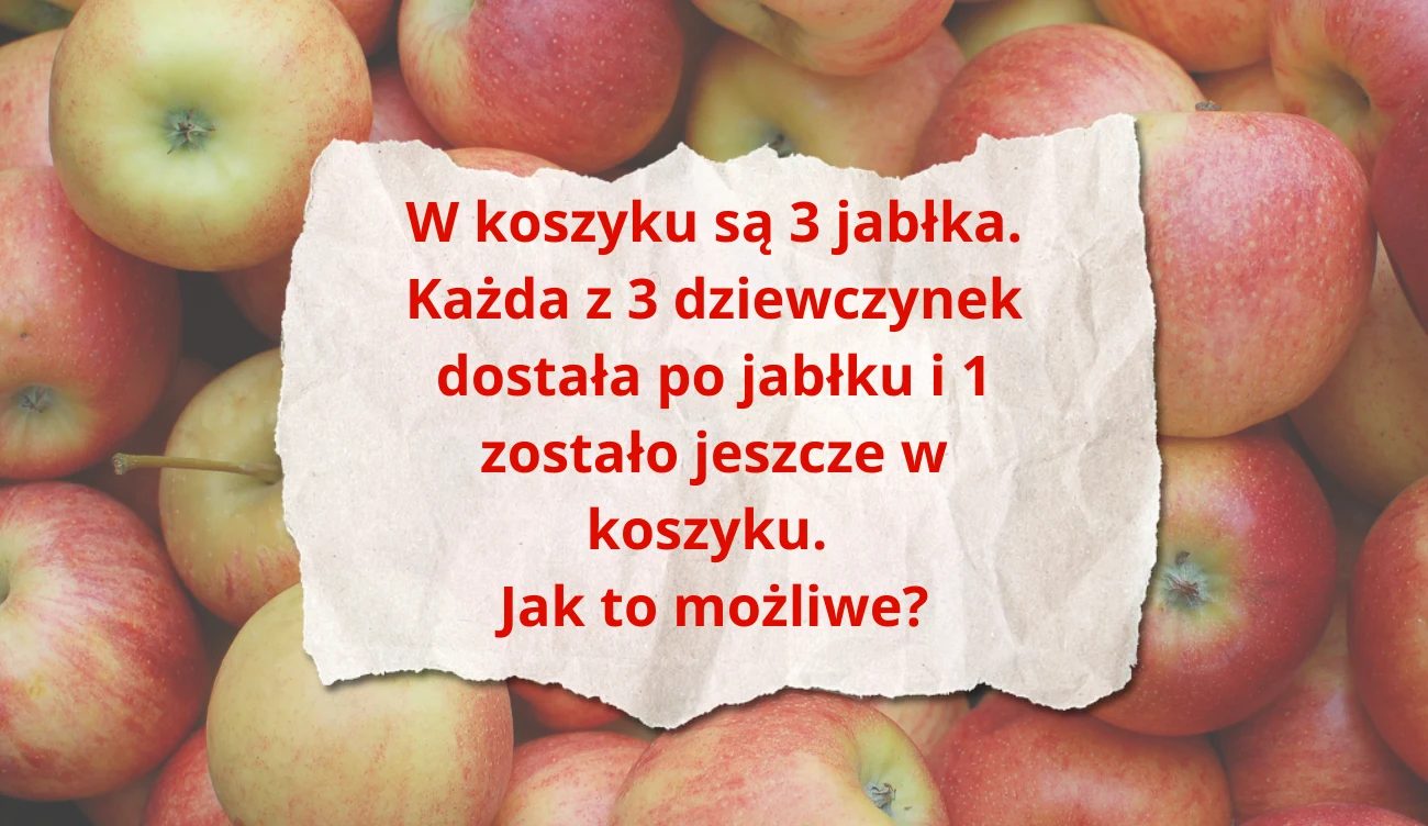 To proste, tylko niewiele osób potrafi zwrócić swoją uwagę na to, co jest logiczne, ale nie powiedziane w zagadce wprost. Na początku treści zadania wszystko się zgadza, są trzy jabłka w koszyku i trzy dziewczynki, więc każda ma po jednym jabłku. Problemem internautów jest to, że jeden owoc został w koszyku. Czy możliwe jest, aby jedna z dziewczynek dostała jabłko z koszykiem?