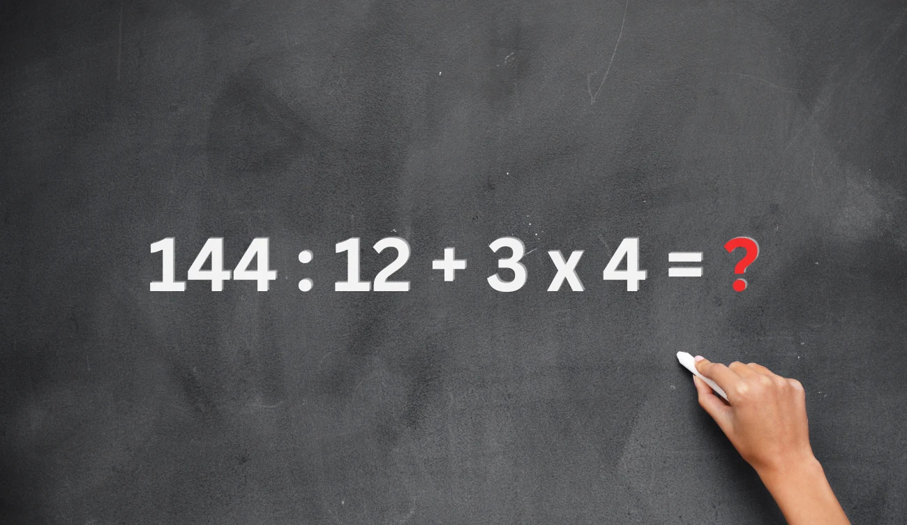 Równanie 144 : 12 + 3 x 4 = ? tylko na pozór wydaje się trudne, ale według kolejności wykonywania działań pierwszeństwo w obliczaniu ma dzielenie lub mnożenie. W zagadce nie ma nawiasów i potęgowania, które powinno wykonywać się na samym początku.