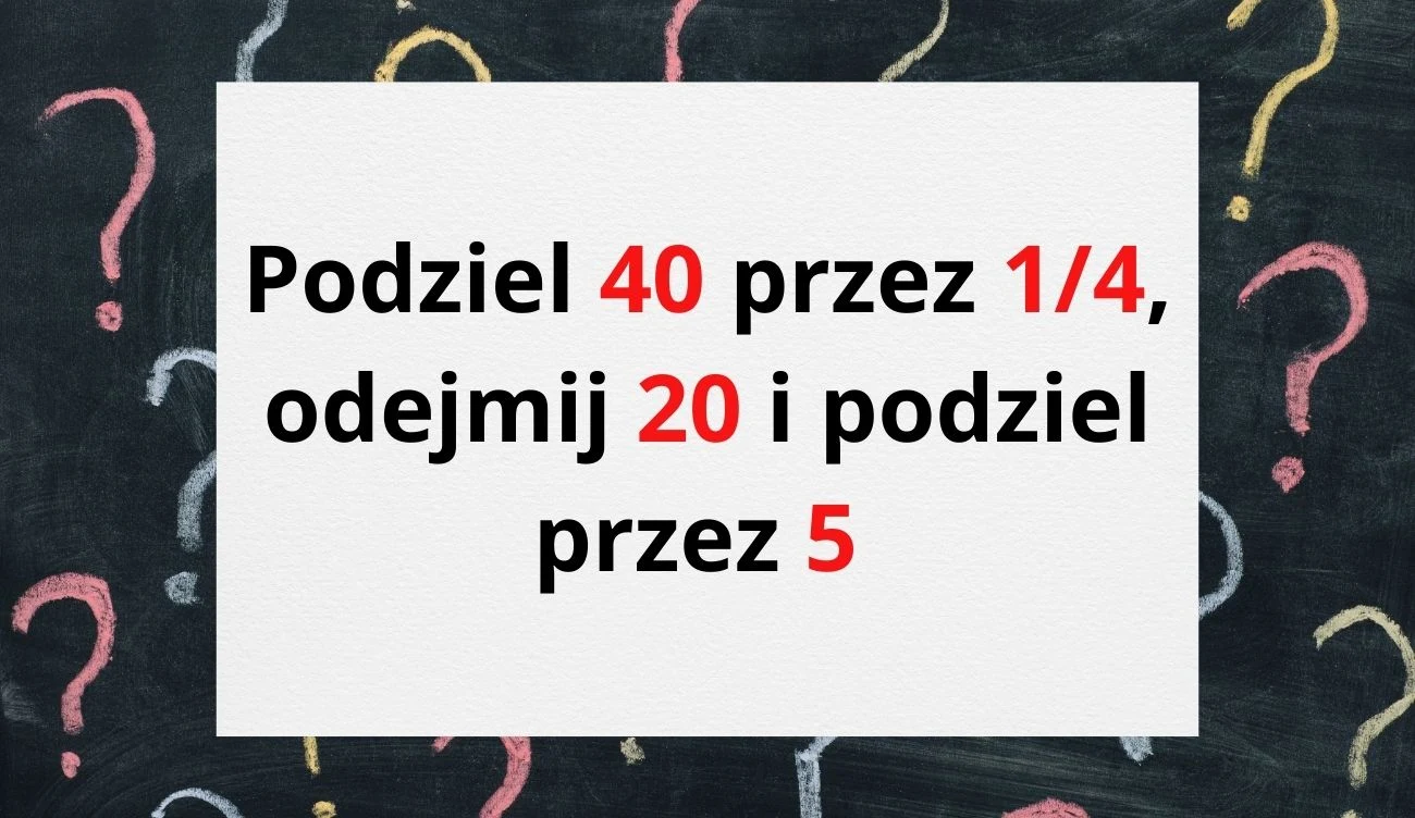 Podziel 40 przez 1/4, odejmij 20 i podziel przez 5