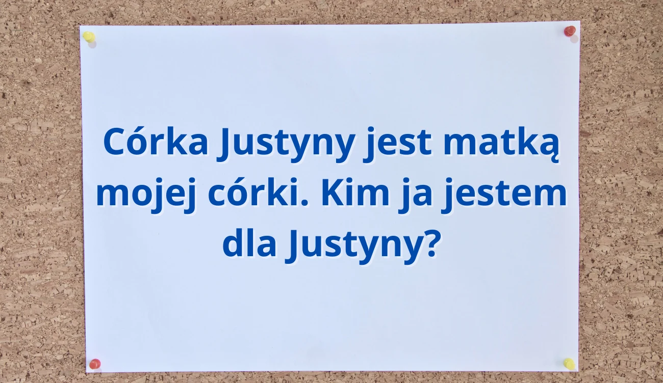 Nie ma nic prostszego! Skup się i przeczytaj kilka razy treść zagadki, na początku możesz poczuć się zdezorientowany, ale nie przejmuj się. Nawet najlepsi mają problem ze zrozumieniem łamigłówki, a potem podają poprawną odpowiedź. W tym zadaniu nie musisz wykonywać obliczeń lub stosować reguł matematycznych. Zastanów się: “Córka Justyny jest matką mojej córki. Kim ja jestem dla Justyny?".