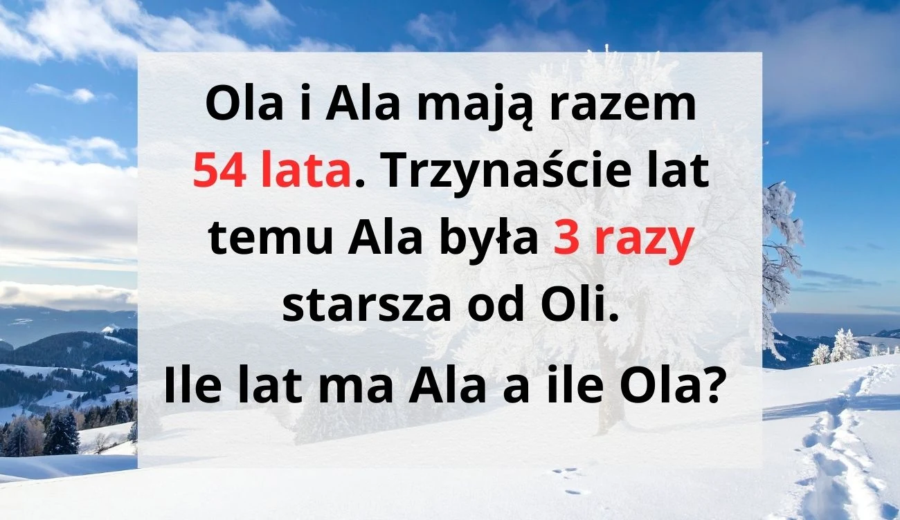Żeby poprawnie odpowiedzieć na pytanie zawarte w zagadce, trzeba w pierwszej kolejności zwrócić uwagę na jeden szczegół. Ala była 3 razy starsza od Oli 13 lat temu. To oznacza, że trzeba skupić się na wieku Oli i Ali sprzed 13 lat i pamiętać, że obie były wtedy młodsze.
