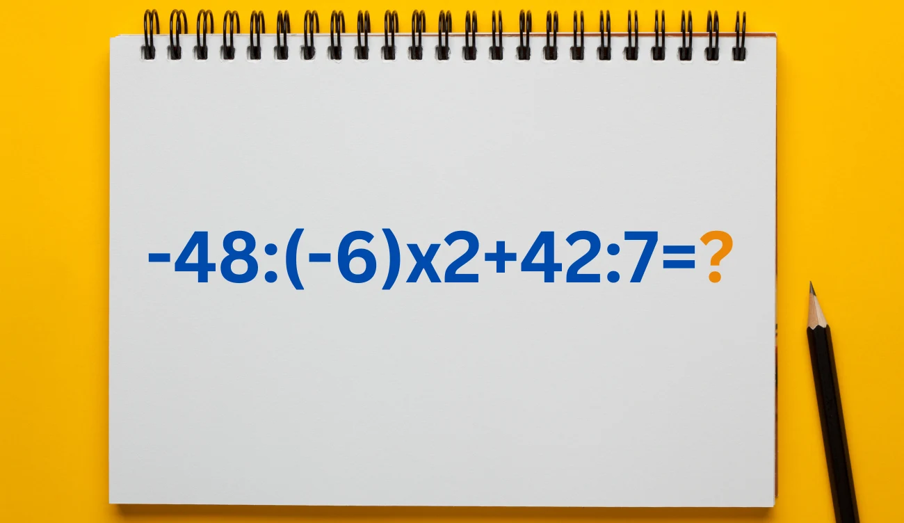 Sercem tej zagadki matematycznej jest poprawne stosowanie kolejności działań. Najpierw wykonujemy działania w nawiasach, następnie mnożenie i dzielenie (od lewej do prawej), a dopiero na końcu dodawanie i odejmowanie. Zacznijmy więc od dzielenia, -48:(-6)=8, bo minus podzielony przez minus daje plus. Kolejny krok to mnożenie: 8×2=16. Teraz pora na drugie dzielenie, ponieważ ono równoważne z mnożeniem. Otrzymujesz wynik: